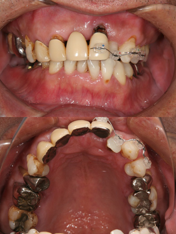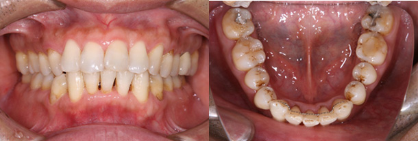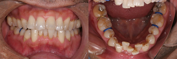 また、「若い頃は歯並びがよかったのに、だんだん前歯が出てきた」という方は、歯周病の進行とともに歯が病的に動いて歯並びが乱れてしまった患者さんです。歯周病が進行すると歯槽骨がやせて歯が動きやすくなり、そこに噛む力が加わってくると、歯が少しずつ倒れ、噛み合わせが変化することでしっかり噛んで食べれないという悩みを抱えるようになってしまいます。そういった場合、歯周病の炎症があっては歯を動かせませんので、まず歯周病の治療をしっかりと行い炎症が治癒したところで矯正治療を開始します。