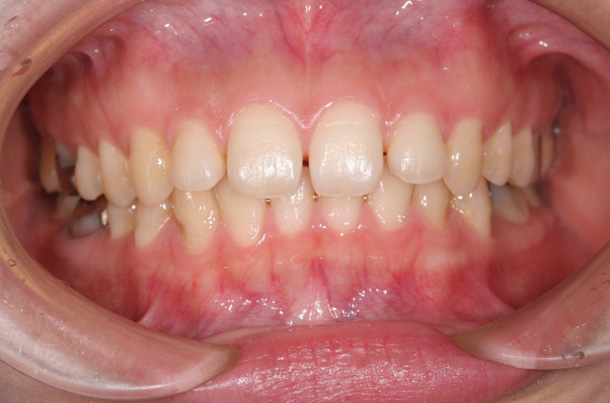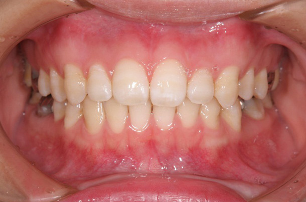 装置:上顎舌側弧線装置(上の前歯を舌側からワイヤーにて唇側へ動かす)