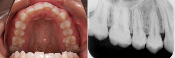 (リンガルアーチにて永久歯第一大臼歯を固定し、自然萌出交換により叢生の改善)